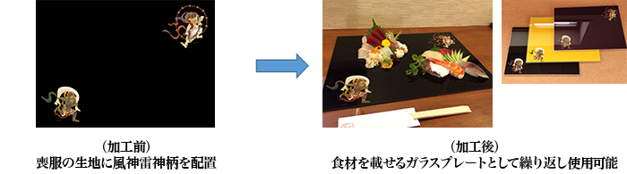 ②黒の喪服地に風神雷神柄を張付け、ガラスプレートに加工