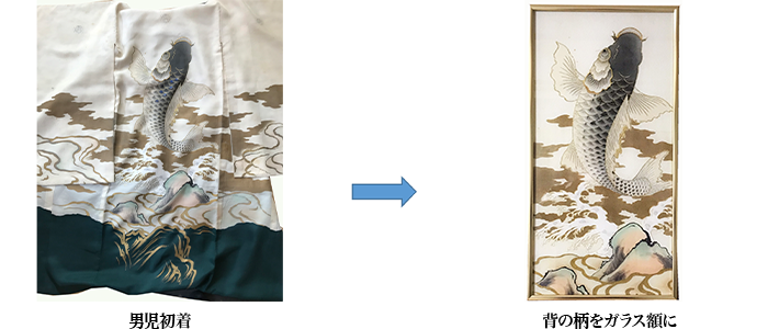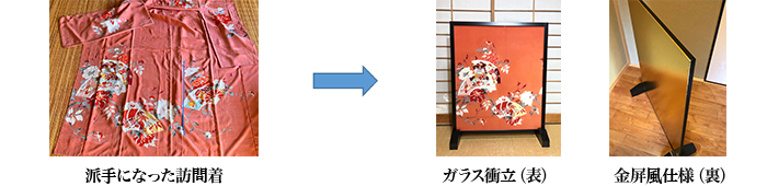 ① 高温加圧・樹脂加工により割れても飛散しない。安全性が向上 ② UVカット機能付きのフィルムにより長期に色ヤケしにくい。退色防止 ③ コーティング加工すると、濃い色は重厚感に、薄い色は透明感になり、柄の色合いは艶やかになる。 ④ タンスに眠る想い出の着物が全く新しいインテリアに変身する。画期的なリメイク -