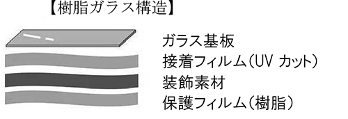 1枚のガラス基板の片面に装飾素材を接着フィルムに接着させ、保護フィルム(樹脂)により素材を保護させる。 下図のように素材をガラス基板と保護フイルム(樹脂)にサンドイッチのように挟み、時間をかけて高温加圧加工する。 水が浸み込まないよう素材の縁を全面コーティングすることで耐水性に優れ、ガラスの飛散防止機能が付加される。 インテリアから建材まで、また曲面への加工も容易なため実用的なお皿等の加工が可能です。裏面が樹脂のため、凹凸のある刺繍などの素材も対応できます。