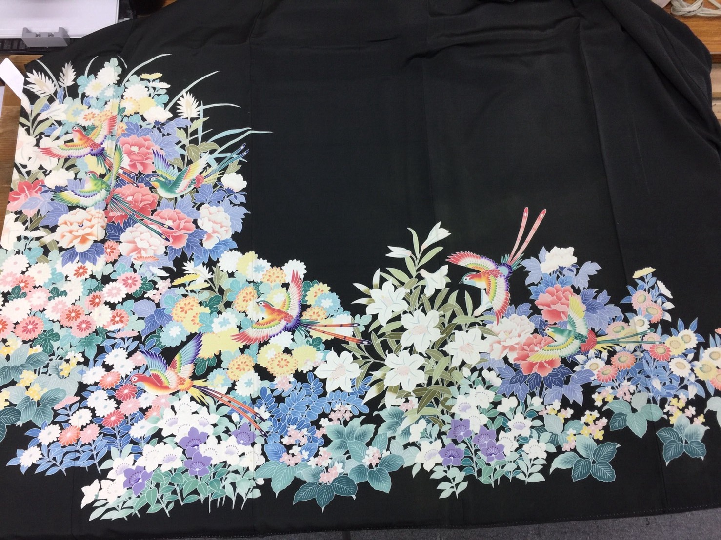 ①留袖を本仕立てから解き、衽・上前・後身頃・下前衽とそれぞれの部分に分け、衝立にしたい範囲で柄併せをします。