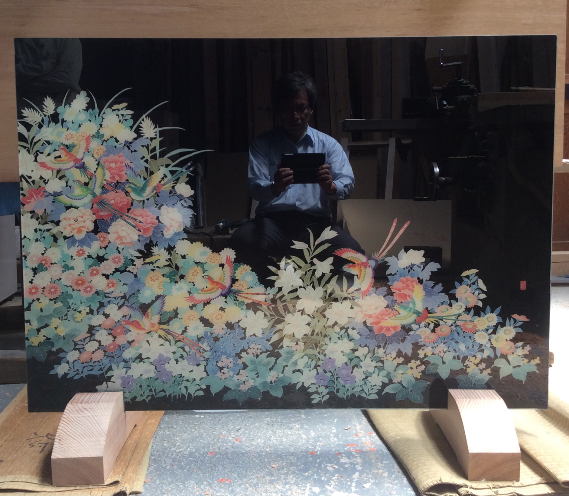 ③裏打ちした屏風の裂地をガラス工場で両面ガラスに加工します。